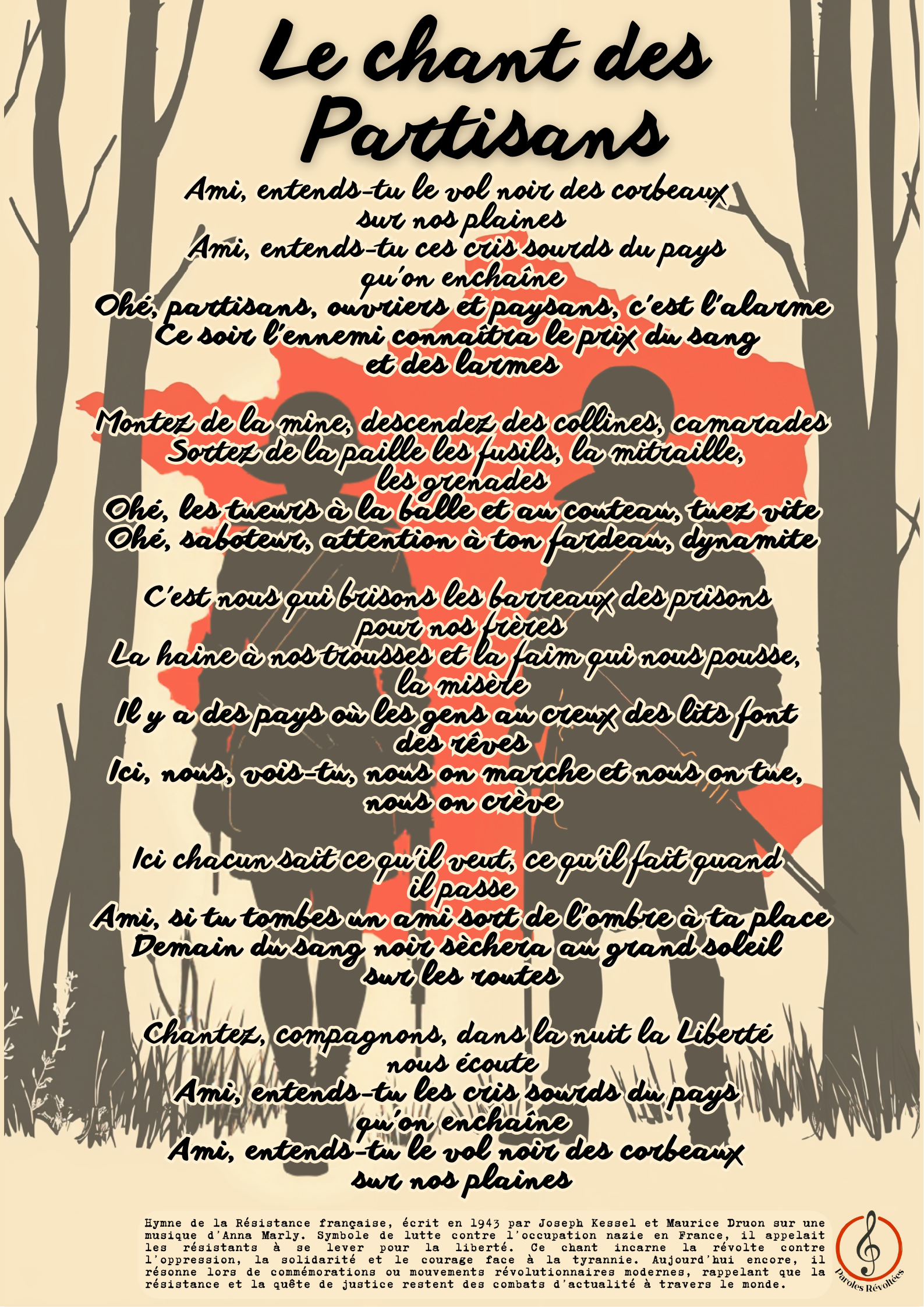 Hymne de la Résistance française, écrit en 1943 par Joseph Kessel et Maurice Druon sur une musique d’Anna Marly. Symbole de lutte contre l’occupation nazie et le régime Vichyste en France, il appelait les résistants à se lever pour la liberté. Ce chant incarne la révolte contre l’oppression, la solidarité et le courage face à la tyrannie. Aujourd’hui encore, il résonne lors de commémorations ou mouvements révolutionnaires modernes, rappelant que la résistance et la quête de justice restent des combats d’actualité à travers le monde.